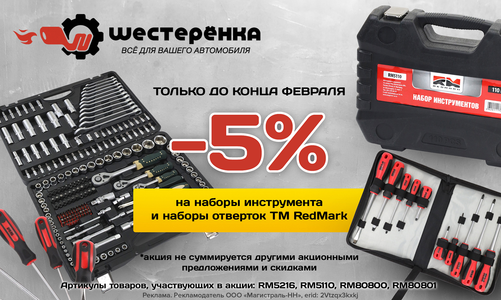 Во всей сети «Шестерёнка» — до конца февраля скидка 5% на наборы* инструментов и отвёрток RedMark. Хороший инструмент не заставляет выбирать между «сойдёт» и «нормально». Он работает так, чтобы вы забыли про усилия и нервы.